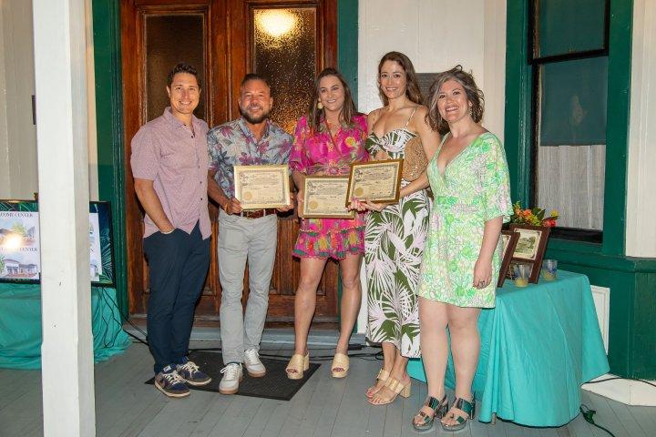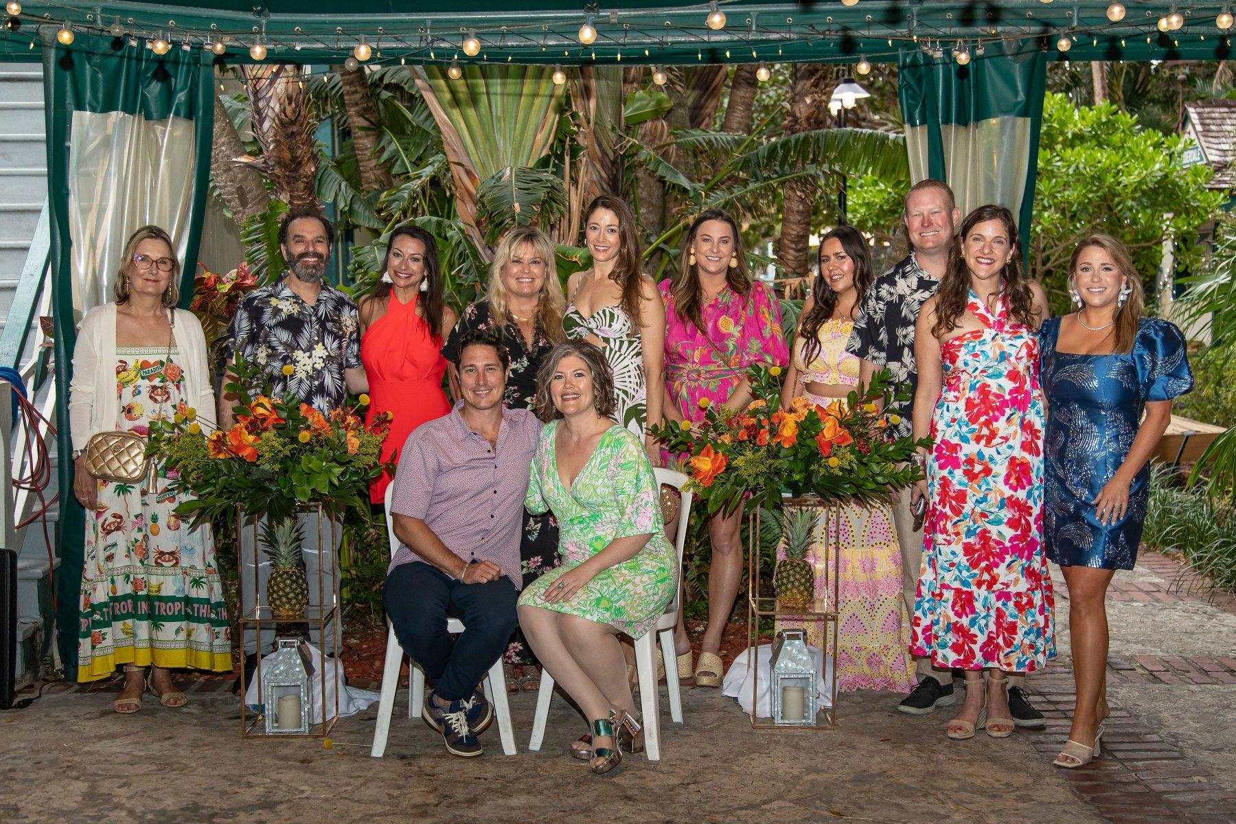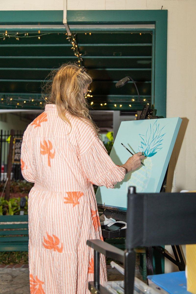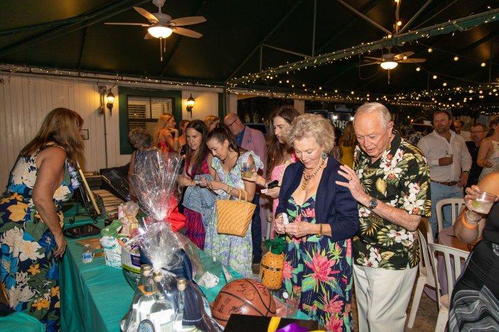 [1] Committee Members: Caroline Carrara, Peter Neirouz, Kristina Lucia, Whitney Dutton, Ashley Sawyer Smith, Maggie Gunther, Sarah Lis, Marianna Seiler DeJager, Abbie Lipton, A.J. Belt, Jenny Belt, Caroline Whiddon [2] Guests bidding on high end raffle baskets [3] Guests in their tropical chic attire enjoying the historic porch [4] Co-Chairs Whitney Dutton and Maggie Gunther presenting certificates to sponsors: Brian Huseman with Amazon, Marianna Seiler DeJager with Tripp Scott, and Sarah Lis with Akerman [5] Honorees Jodi and Paul Tanner being presented their Pineapple Jam plaque [6] Team at RMZ Law being presented their Pineapple Jam plaque [7] Artist, Heather Renee, creating a live painting at the event [1] [2]