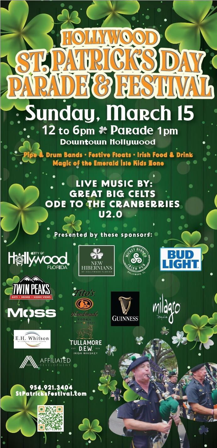 Downtown Hollywood will once again turn green for the annual St. Patrick’s Day Parade and Festival on Sunday, March 15th, 2026 from 12:00 p.m. Noon to 6:00 p.m. Hosted by the City of Hollywood and the Hibernians of Hollywood, this festive community tradition brings music, culture and family fun to the heart of the city.