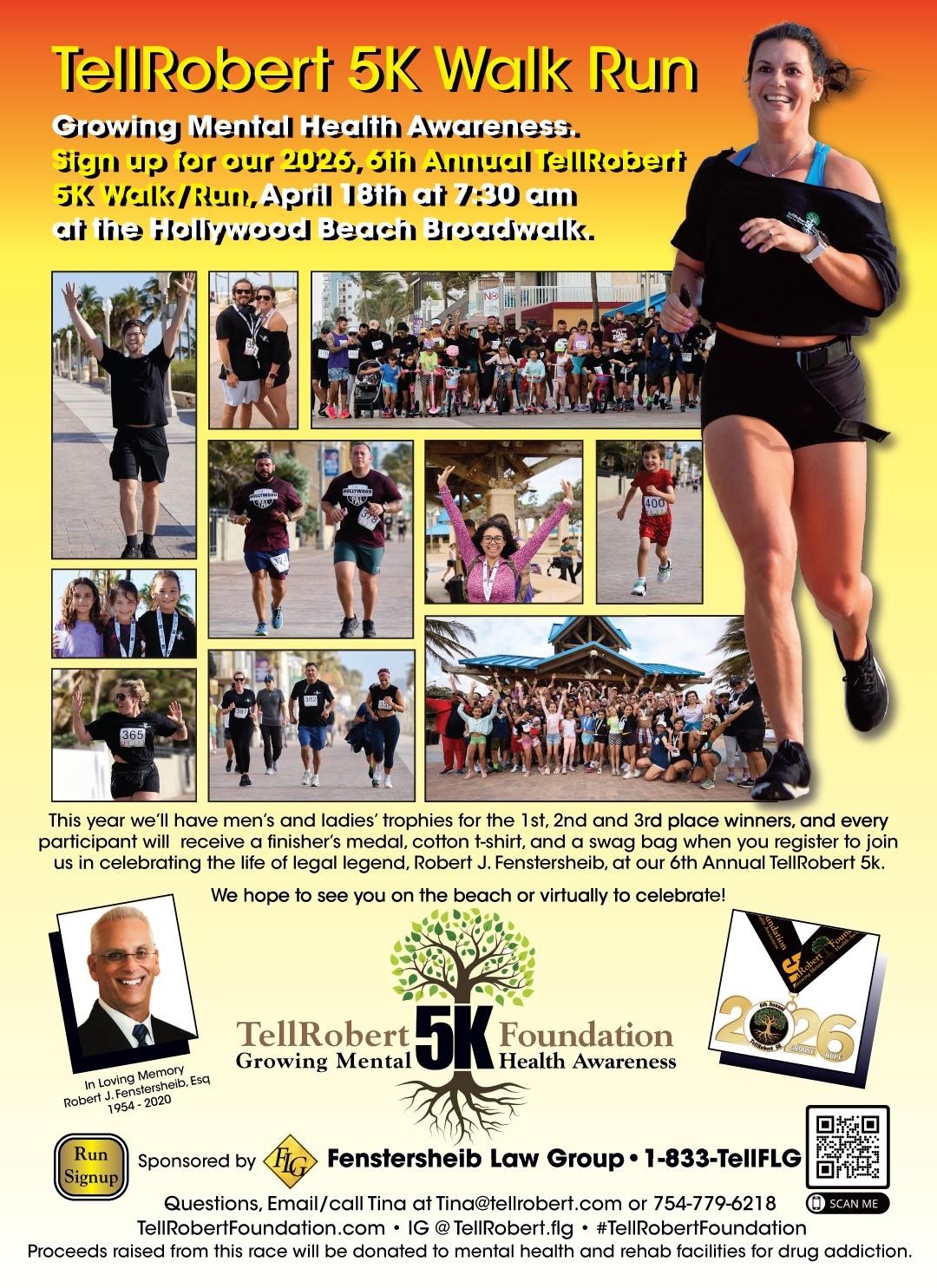 Don’t miss the Tell Robert 5K Run/Walk Race, now in its 6th year, sponsored by Fenstersheib Law Group. According to Stephanie and David Fenstersheib, on April 18th at 7:30 a.m. our annual race will be taking place on the Hollywood Broadwalk at the Charnow Park pavilion. Stephanie said, “This is more than just a race — it’s a heartfelt event, in loving memory honoring our father, Robert J. Fenstersheib’s legacy that builds awareness about mental health and addiction.”