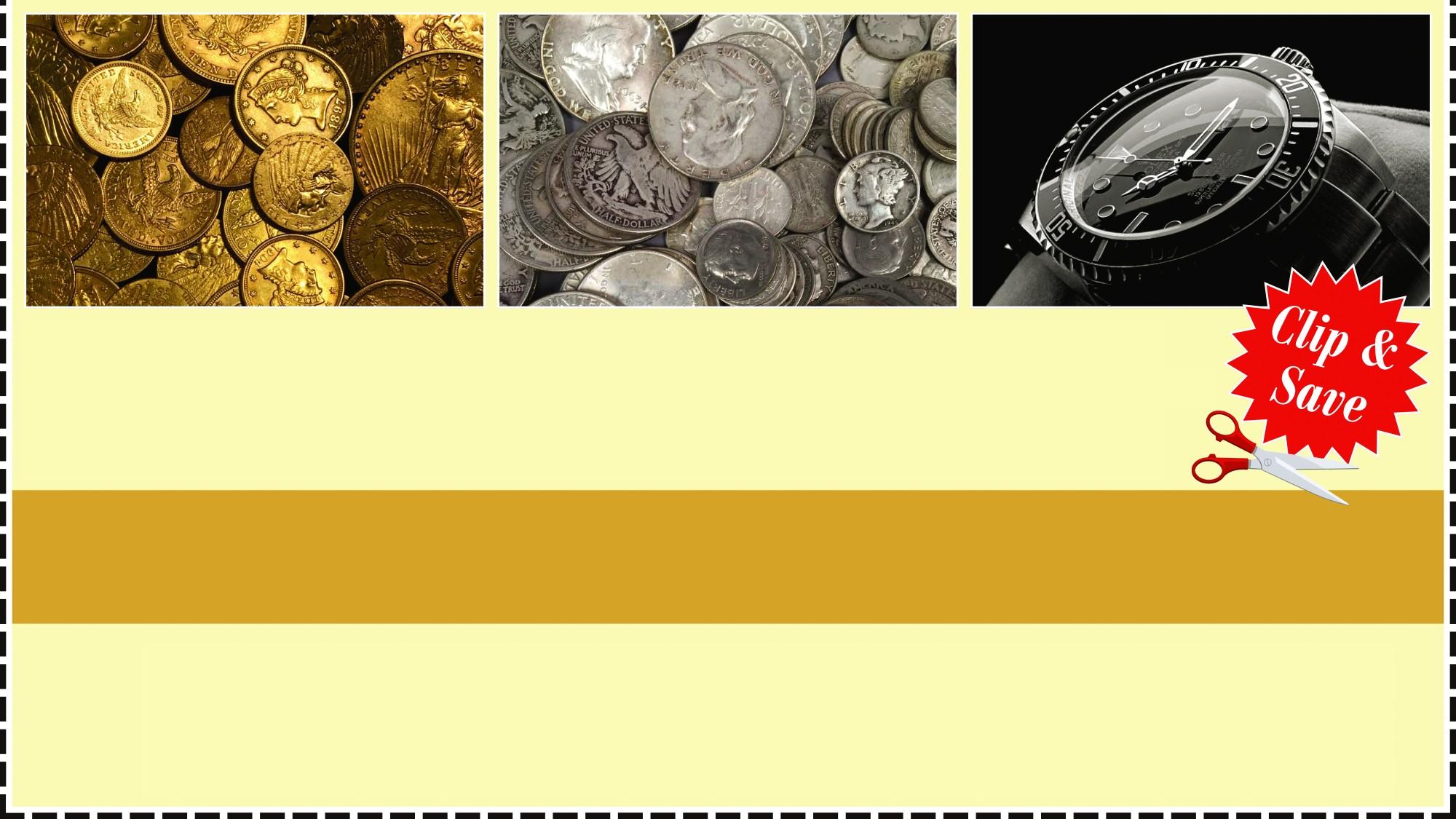 Old or New Jewelry • Broken, Antique, & Costume Jewelry • Engagement Rings • Charms, Pins & Chains • Gold/Silver Bars • Sterling Silverware • All Things Gold/Silver • Belt Buckles • Old Clocks • Glassware • Cut Glass • Depression Glass • China • Waterford Crystal • Crystal Items • Hummels • Royal Doultons • Oriental Rugs & Glass • Russian Enameled Items • Cartoon Art • Old Banks • Old Crocks • Old Door Stops • Old Pottery Items • Oriental Pottery • Oriental Glass • Old Advertising Items • Old Carousel Figurines • Buck Rogers Items • Old Disney Items • Cigar Store Indians • Slot Machines • Old Coin Operated Machines • Currier & Ives Prints • Old Prints • Paintings • Collector Prints • Old Fire Department Items • Flash Gordon Items • Whirligigs • Wood Carvings • Antique Lamps • Old Dolls • Old Teddy Bears • Old Bird Decoys • War Memorabilia • War Models • War Pictures • War Weaponry • Old Knives • Old Swords • Old Stamps • Autographs • Old Letters • Old & New Tools • Automobiles • Entire Estates