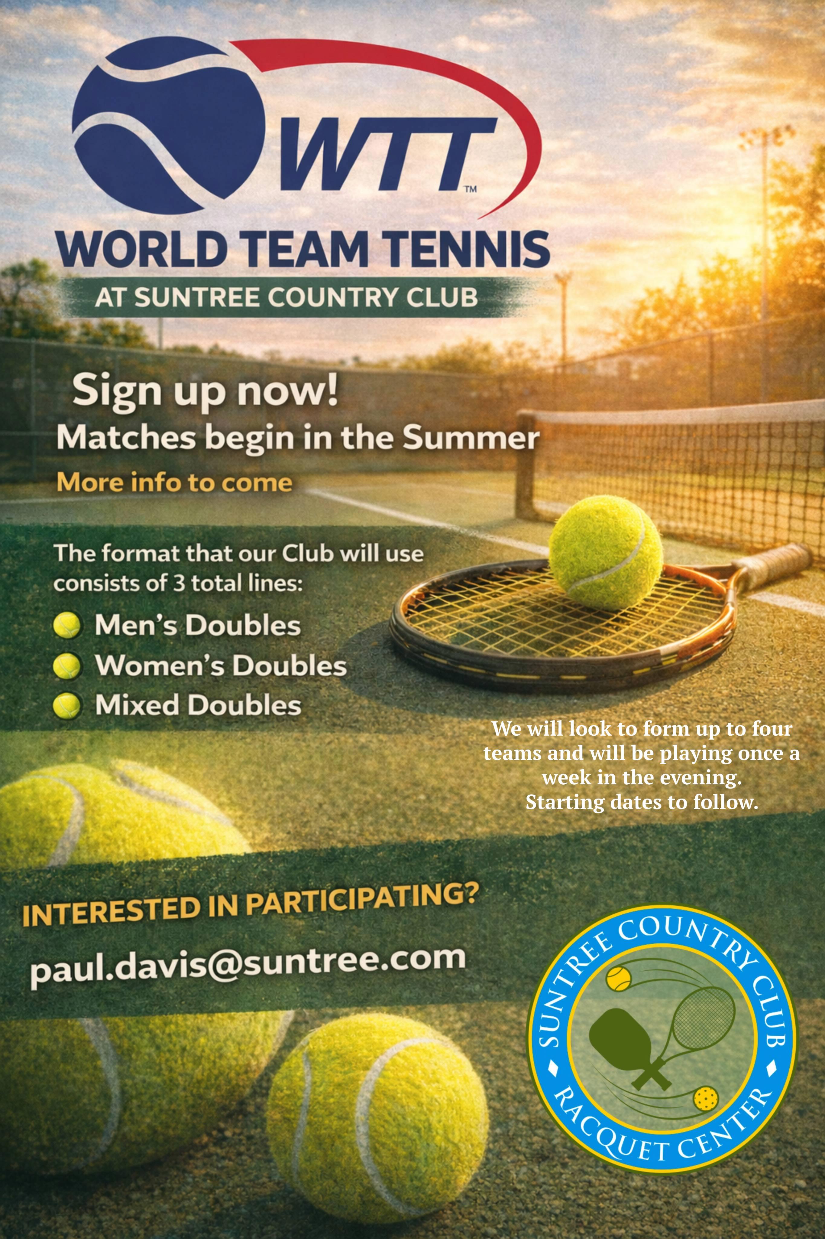 World Team Tennis - Play begins this summer, so sign up quickly! See flyer for details.