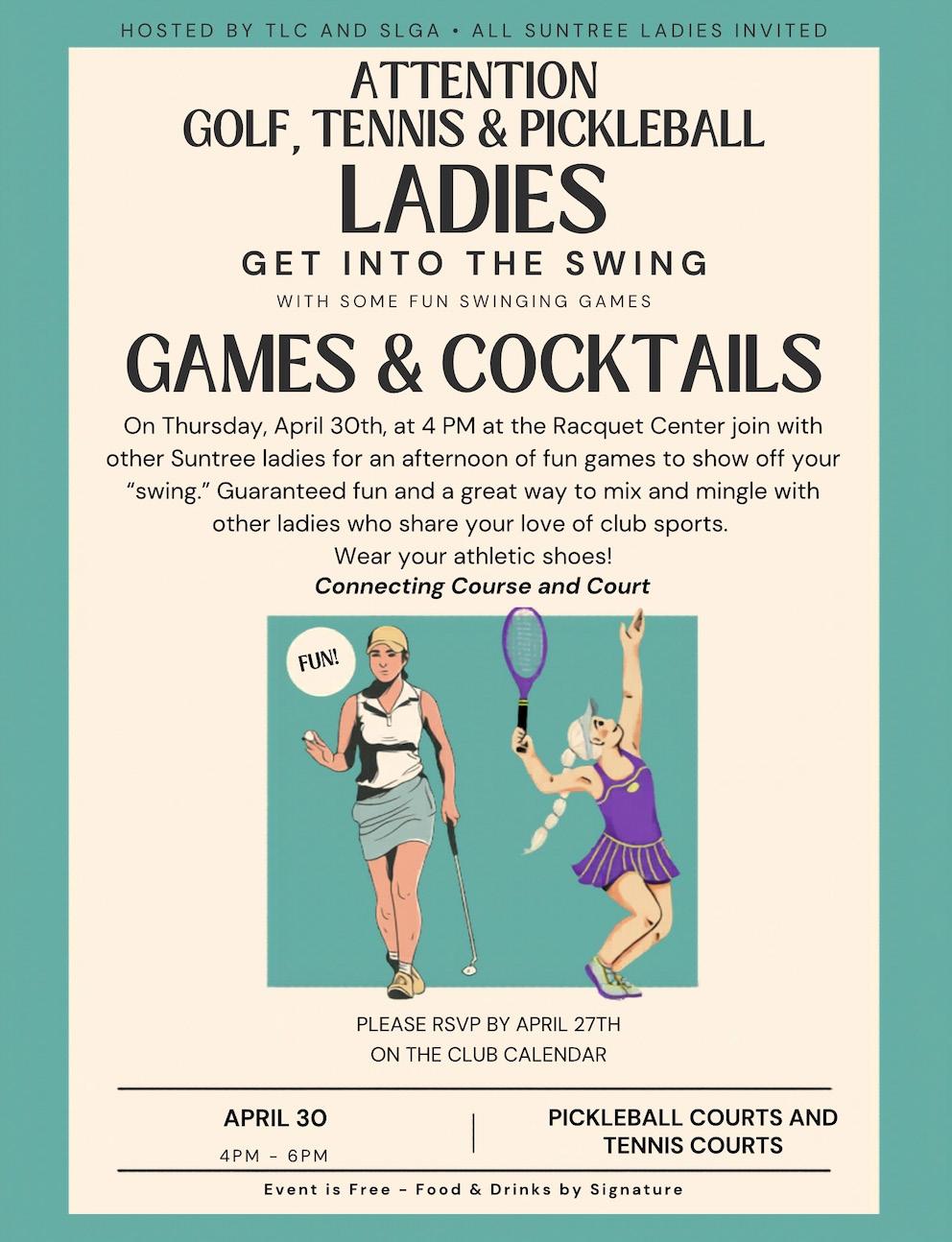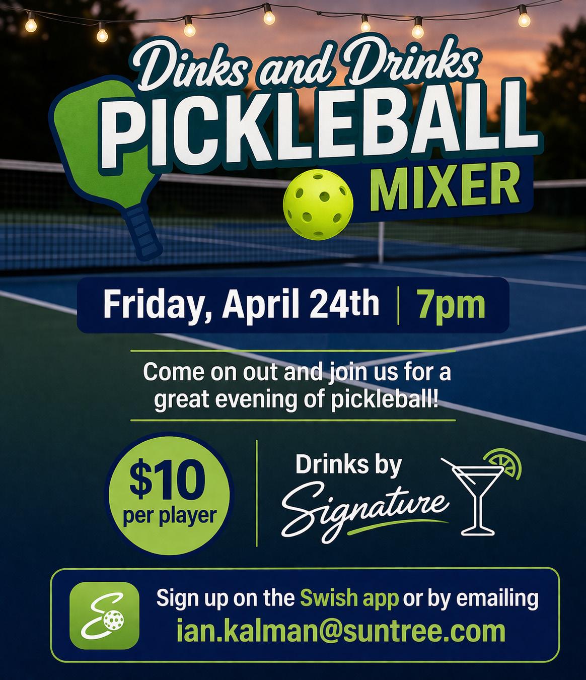 Dinks and Drinks Pickleball Mixer - April 24th, 7pm see flyer for details and sign up on the Swish app