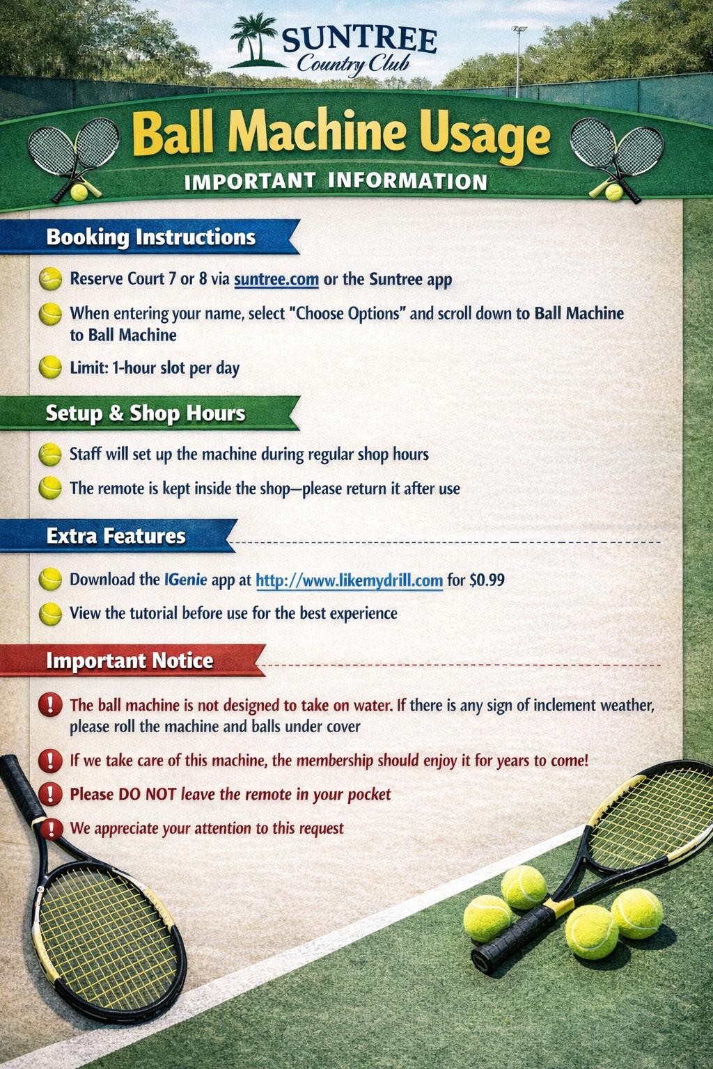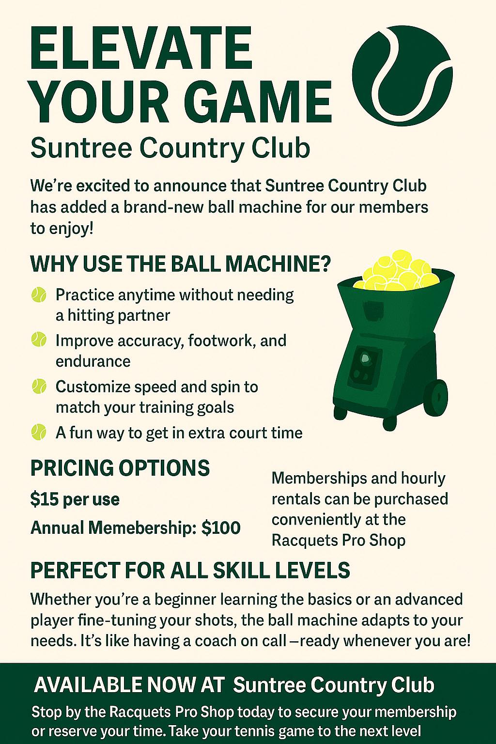 The Club is pleased to offer complimentary use of the ball machine as a benefit to members.