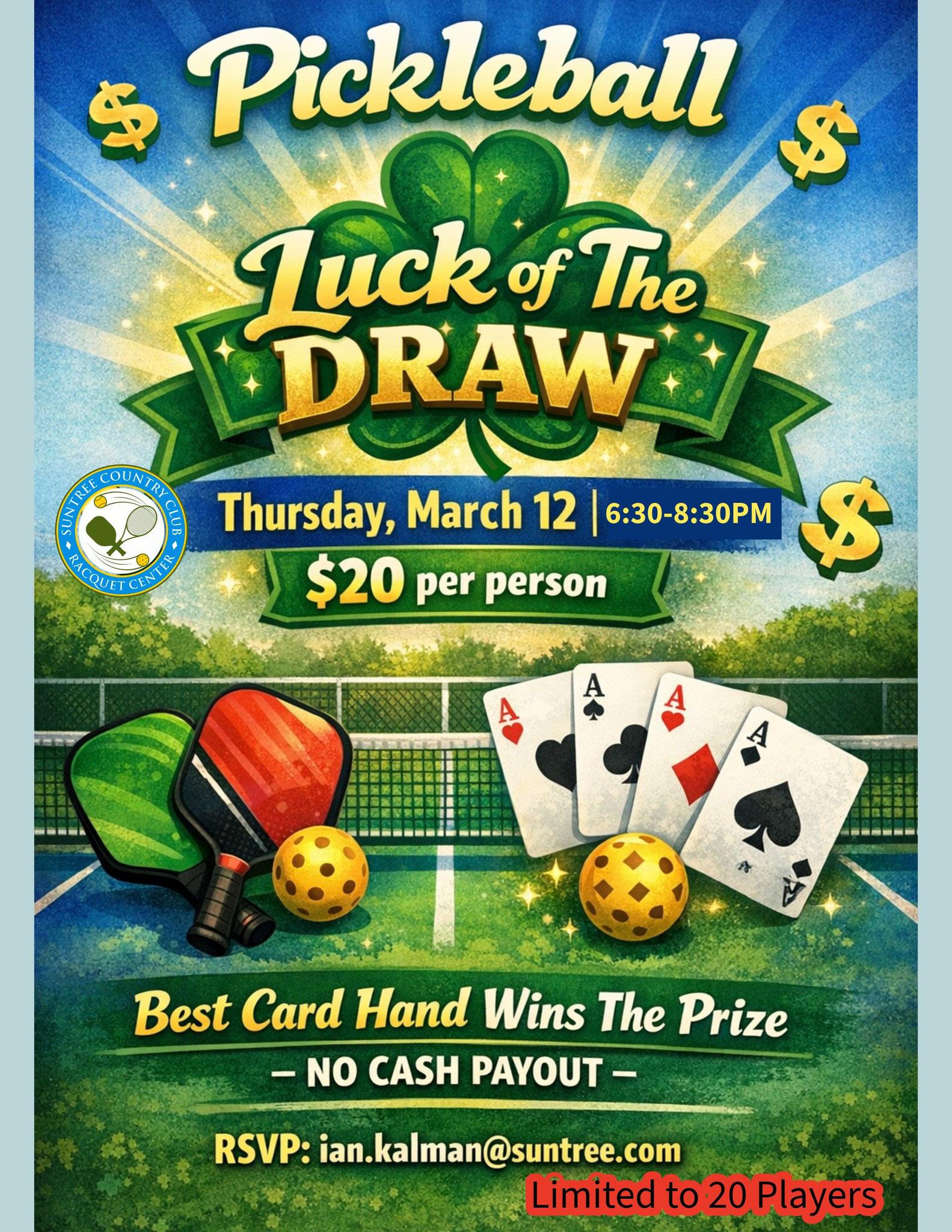 Luck of-the-Draw Pickleball - April 10th, 7pm see flyer for details and sign up on Swish app