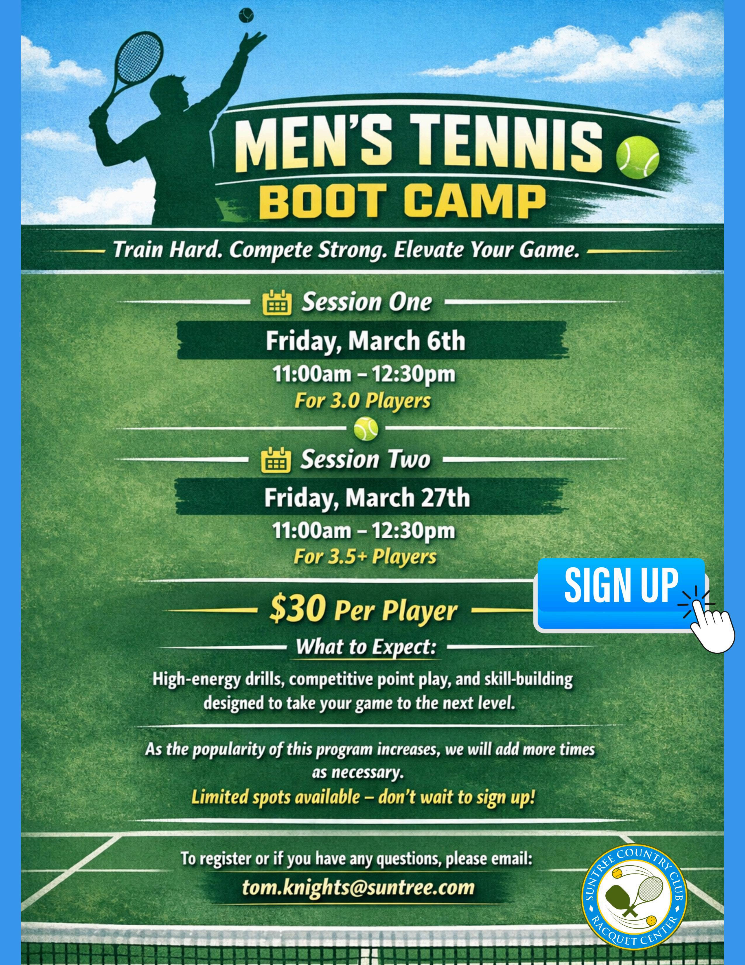 Men’s Tennis Boot Camp with Tom Knights: He's doing it again in April! Next sessions: April 10 and April 18
