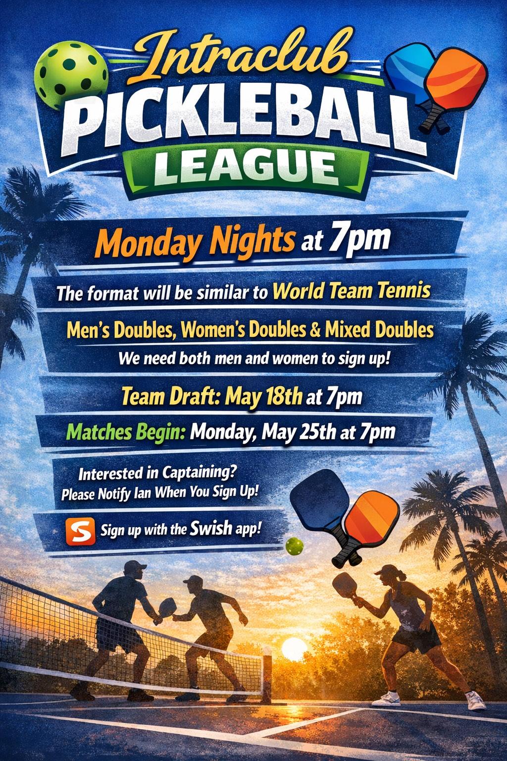 Intraclub Pickleball - We will be playing on Monday nights starting late May. The format of play will be similar to our Suntree World Team Tennis format with a line of Men’s Doubles, Women’s Doubles and a line of Mixed Doubles. There will be a team draft the week before play begins so sign up early!