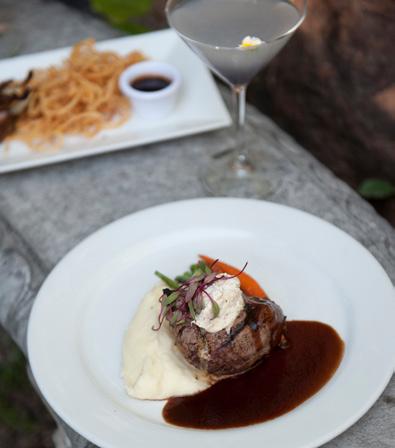 Clockwise from left: The Grill at Knob Hill’s outdoor seating; rosé al fresco; a delicious meal.