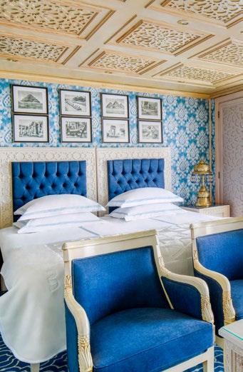 The luxurious décor of the 443-foot, 152-passenger S.S. Antoinette-Uniworld’s first Super Ship-features fine Brazilian marble on the walls and floors, a 19th-century Ven etian glass mirror, a stylish Bar du Leopard with full-service bar, and an onboard cinema. The two-s tory foyer boasts a 10-foot blue Strauss Baccarat chandelier with huge sapphires-a stunning piece that once hung in New York’s famous Tavern on the Green-and a collection of original artwork is displayed throughout the ship.