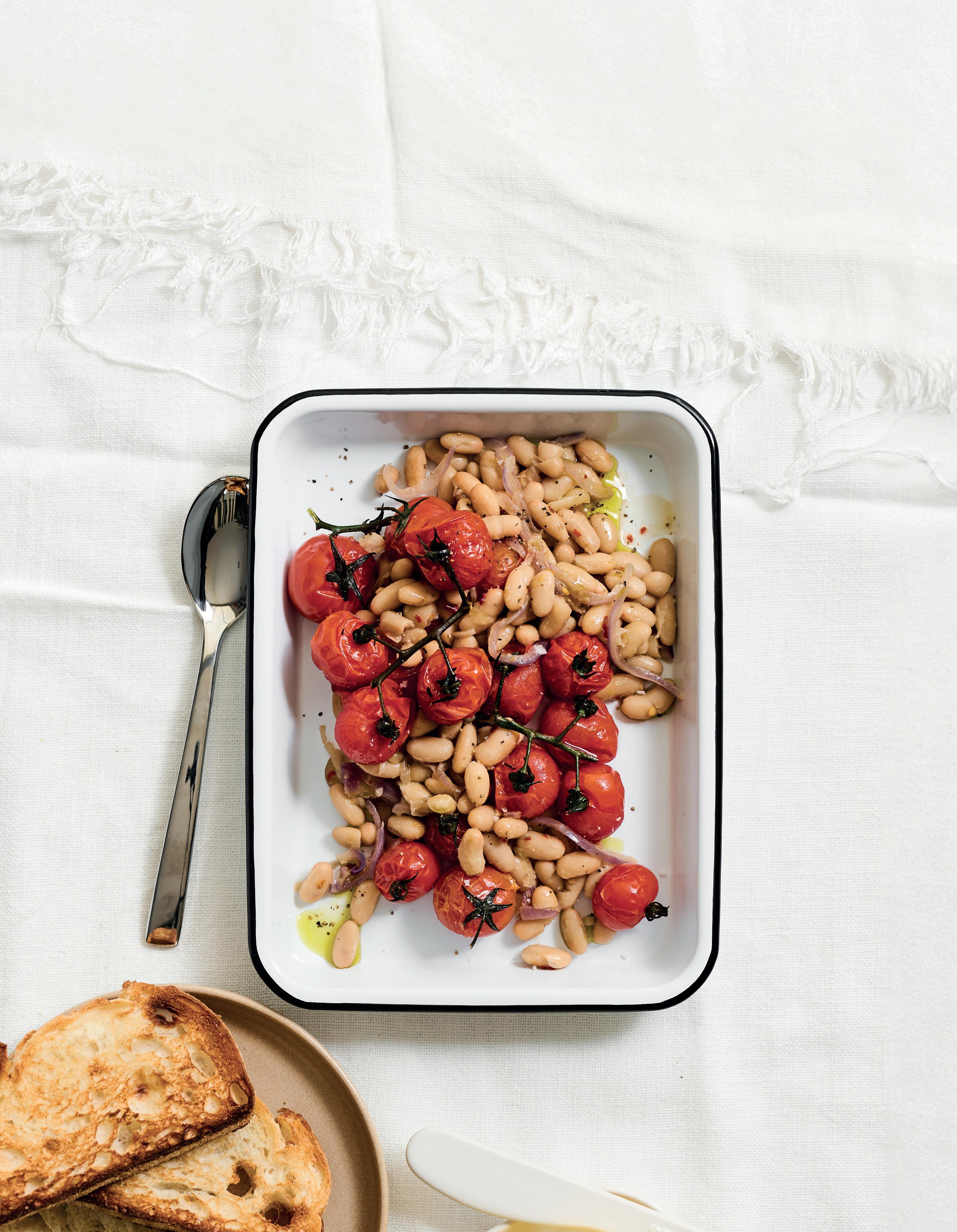 1. Heat the EVOO in a frying pan over high heat. Add the tomatoes and cook for 2 minutes. Add the shallot and garlic, stir and cook for another minute. Add the beans, chilli flakes, salt and pepper, stir to combine. Reduce heat to medium, cover frying pan and cook for 5 minutes.