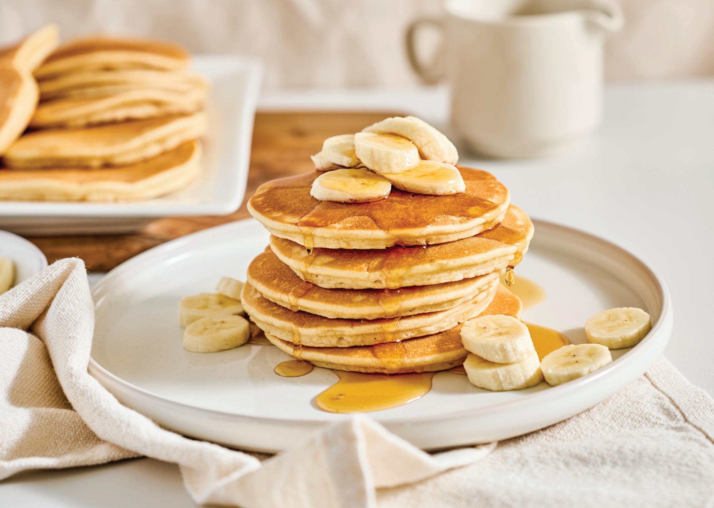 3. Melt a little butter in a frying pan over medium heat and spread evenly. Using a cup, pour 3–4 circles of batter into the frying pan. Cook until little bubbles appear on the surface (approximately 1½ minutes). Flip and cook the pancake on the other side until golden brown and cooked through (approximately 1½ minutes).