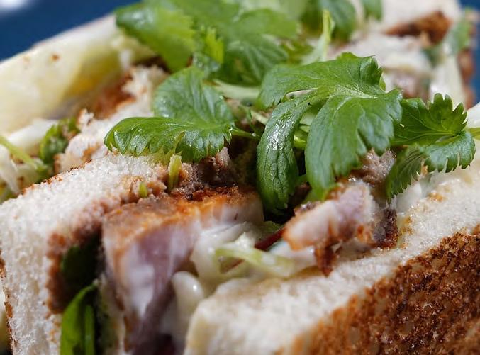 Sandwich m/sprøstekt ribbe, syltet gulrøtter og daikon, agurk, paté, majones, chili, koriander og soyasaus