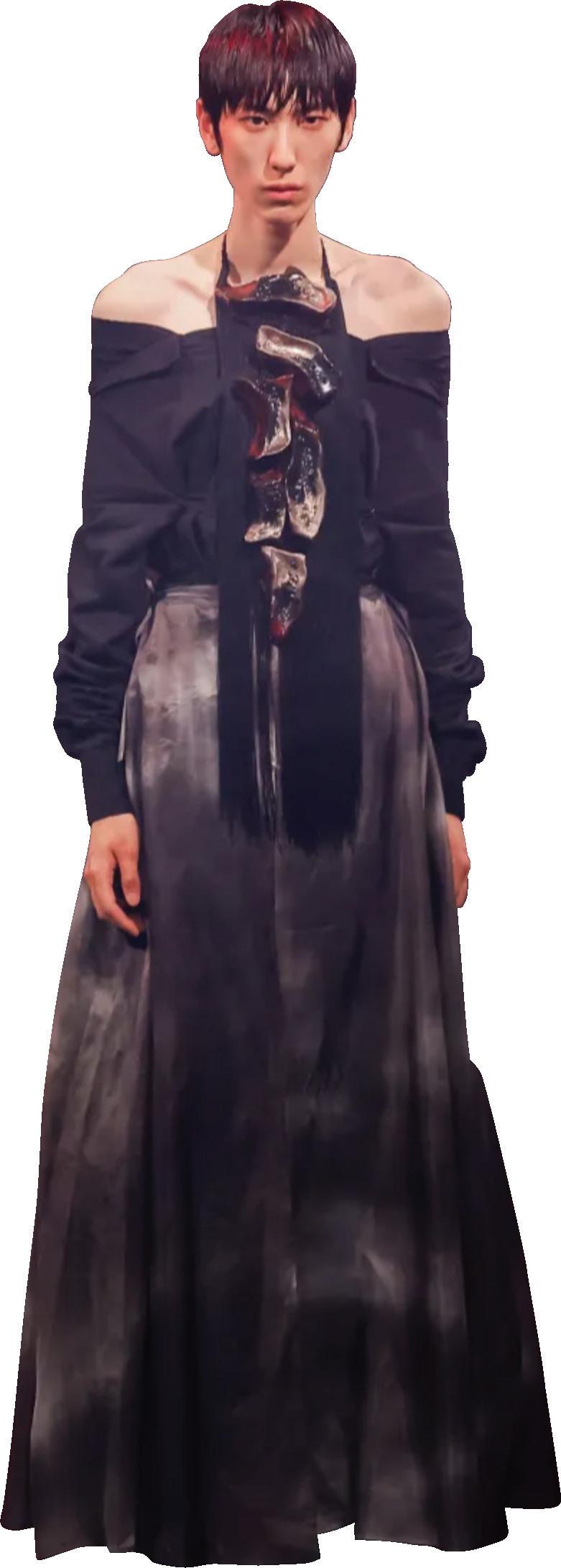 The art of conceal and reveal in the form of layers and cutaways was seen at YUIMA NAKAZATO’S Couture Fall 2024 collection. This collection drew initial inspiration from Nakazato’s experiences designing stage costumes for Mozart's opera Idomeneo, which explores war and relationships in ancient Greece. A great example is this look in a hue that pairs with Mara 8-86.