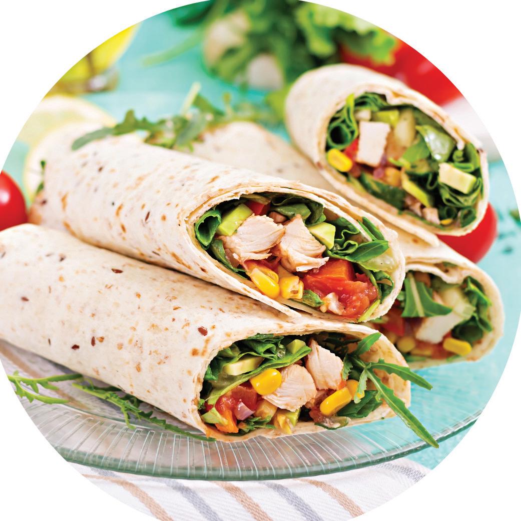 Be sure to use lean protein such as chicken breast (alternatively you could use fish, it’s also easy to create a vegetarian version) and lots of summer salad favourites like grated carrot, cucumber, and avocado. If using tomato, finely dice it to avoid making the wrap soggy. If adding cheese use low fat cheese, for example, edam, reduced-fat cheddar, or reduced-fat tasty cheese.