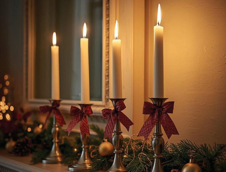 Bows will look good for any type of decoration. On your front door, adorn your wreath with a larger-than-life bow, add bows and ribbons to your cushions to dress them up as presents, or simply fix a bow to a series of candlesticks or a modern and very stylish take on decor.