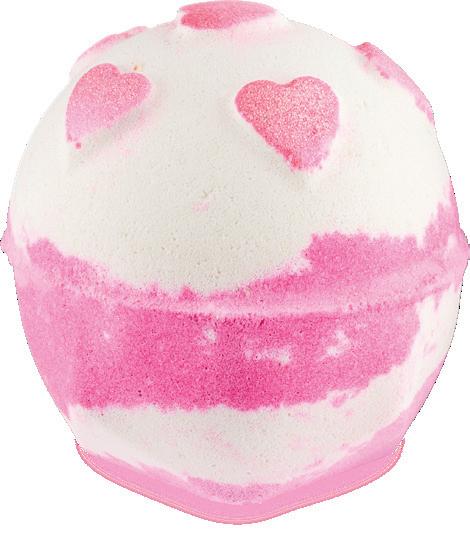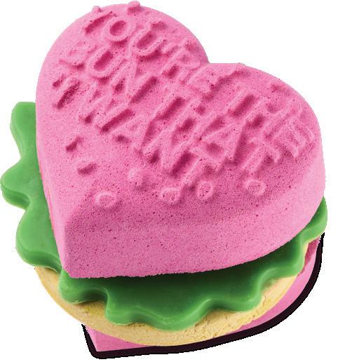 Lush’s Love Burger serves three loved-up courses; a zesty Sicilian lemon burger patty bubble bar, layered with Rhubarb & Custard scented salad soaps, cuddled between cherryfragranced bath bomb buns! The ultimate bathing gift, bathers can use all components together or separately.
