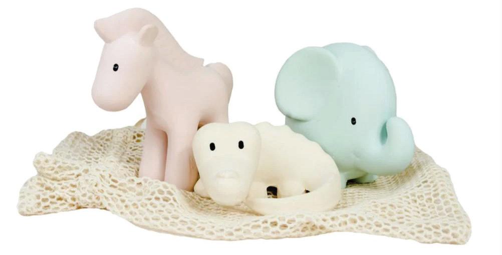 This delightful collection of animals are made from organic natural rubber coloured in soft pastel shades, each containing an enclosed rattle.