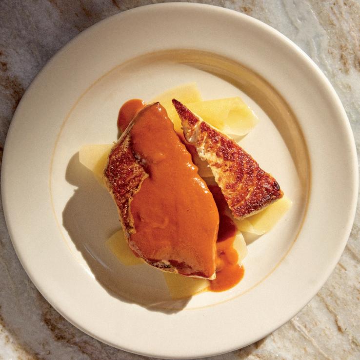 Begin with warm, citruskissed olives or the Chicken Liver Parfait, perfectly complemented by toasted focaccia and bacon jam. For mains, the mafaldine with slow-braised duck and oyster mushrooms or the Grilled Organic Half Chicken ‘Diavola’ with smoked yogurt and romesco are standout choices.