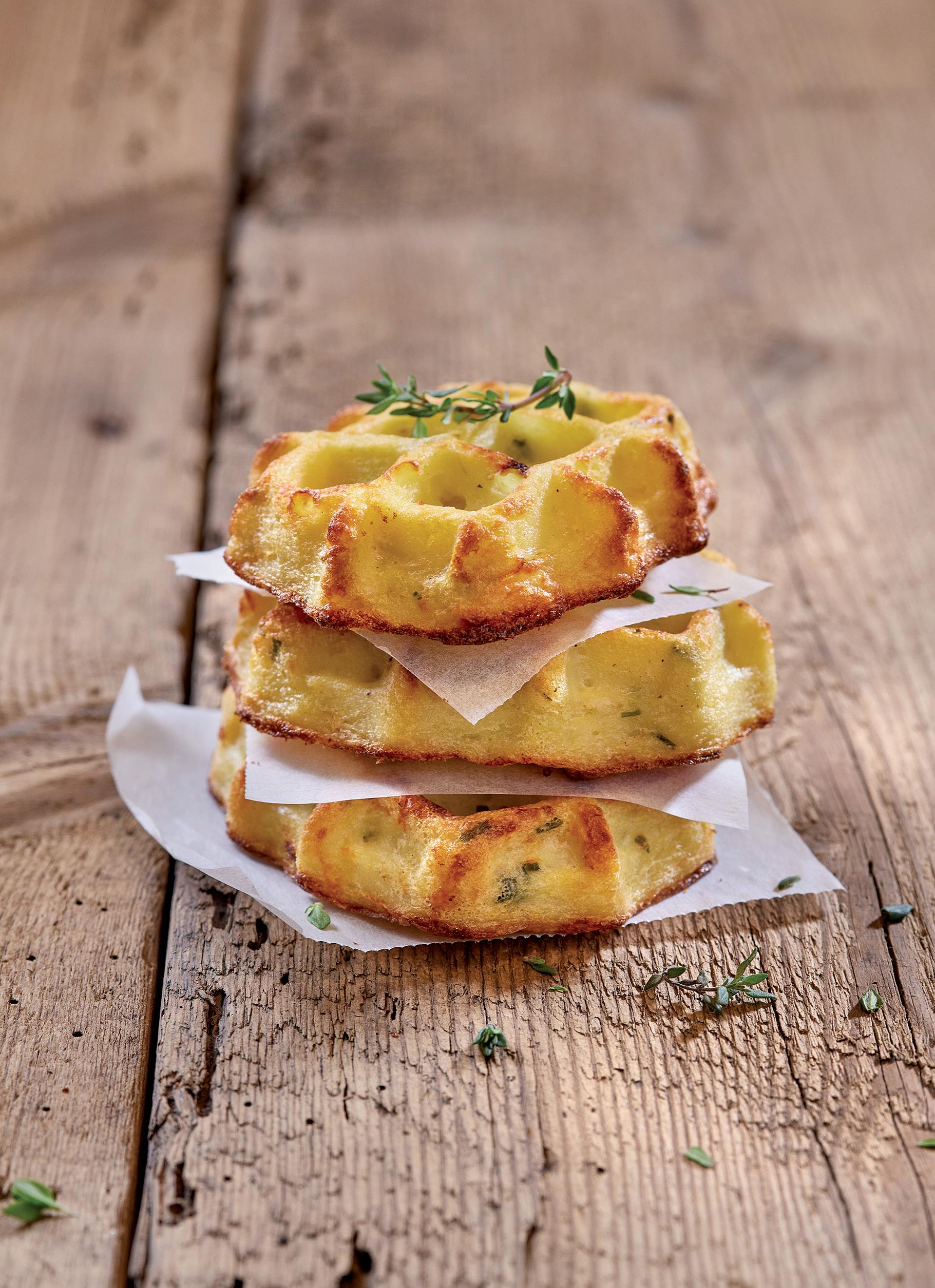 A waffle made of “melt in the mouth” mashed potato center with sliced potato and a light crispy exterior.