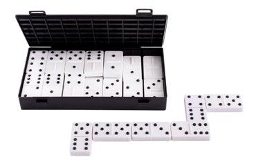 Très grandes pièces de dominos (5 x 2,5 cm) en plastique blanc avec des points noirs superposés. Facile à voir et à toucher. Pour personnes aveugles et malvoyantes. Jeu de 28 pièces avec boîte de rangement en plastique.