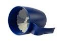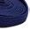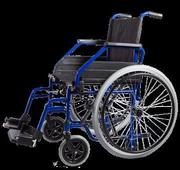Fauteuil roulant pliable doté d’un cadre en acier bleu recouvert de nylon noir. Pourvu de grandes roues arrière à cerceau pour permettre à l’utilisateur de se propulser lui-même.