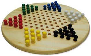 Jeu de société Halma (jeu de dames chinois) de forme ronde, en bois simple. Comprend 60 pions en bois colorés. Pour 2 à 6 joueurs. Diamètre du plateau 28 cm.