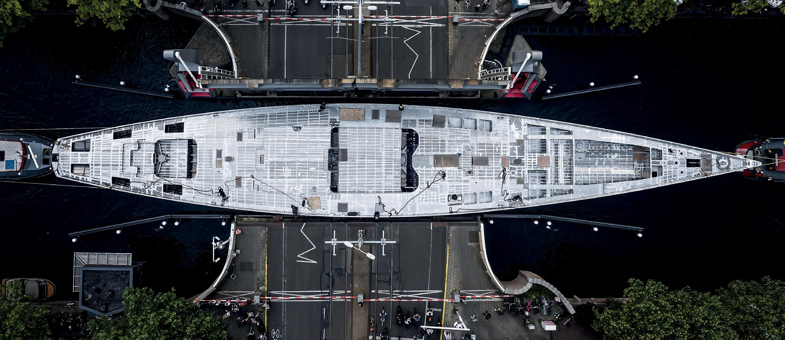 In fact, the project has touched on virtually every facet of refit. Both the bow and stern were to be cut off, with a total of six metres to be added overall as new steel bow and stern sections fabricated offsite by Talsma. The additional volume forward, combined with relocating the tender garage aft, would allow for a proper seating area in the bow and a twin-anchor system, as well as an additional crew cabin below.