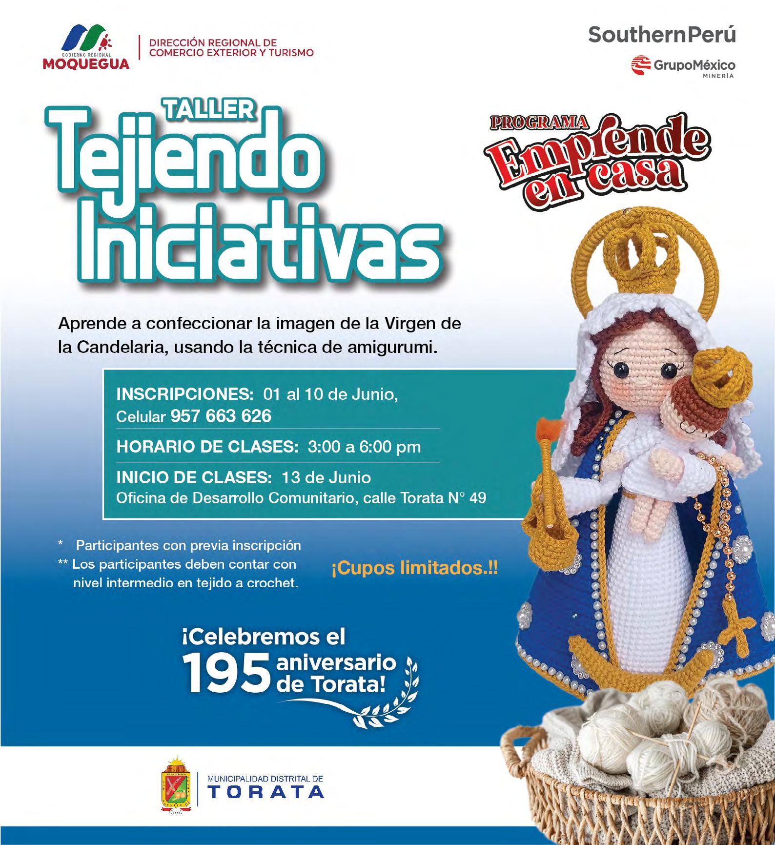 del crochet para producir, prendas, muñecos y otros distintivos de Torata. Por lo pronto 22 emprendedoras fueron certificadas por la Dirección Regional de Turismo de Moquegua (DIRCETUR) tras concluir exitosamente el taller en el que tejieron, una muñeca con atuendo netamente torateño.