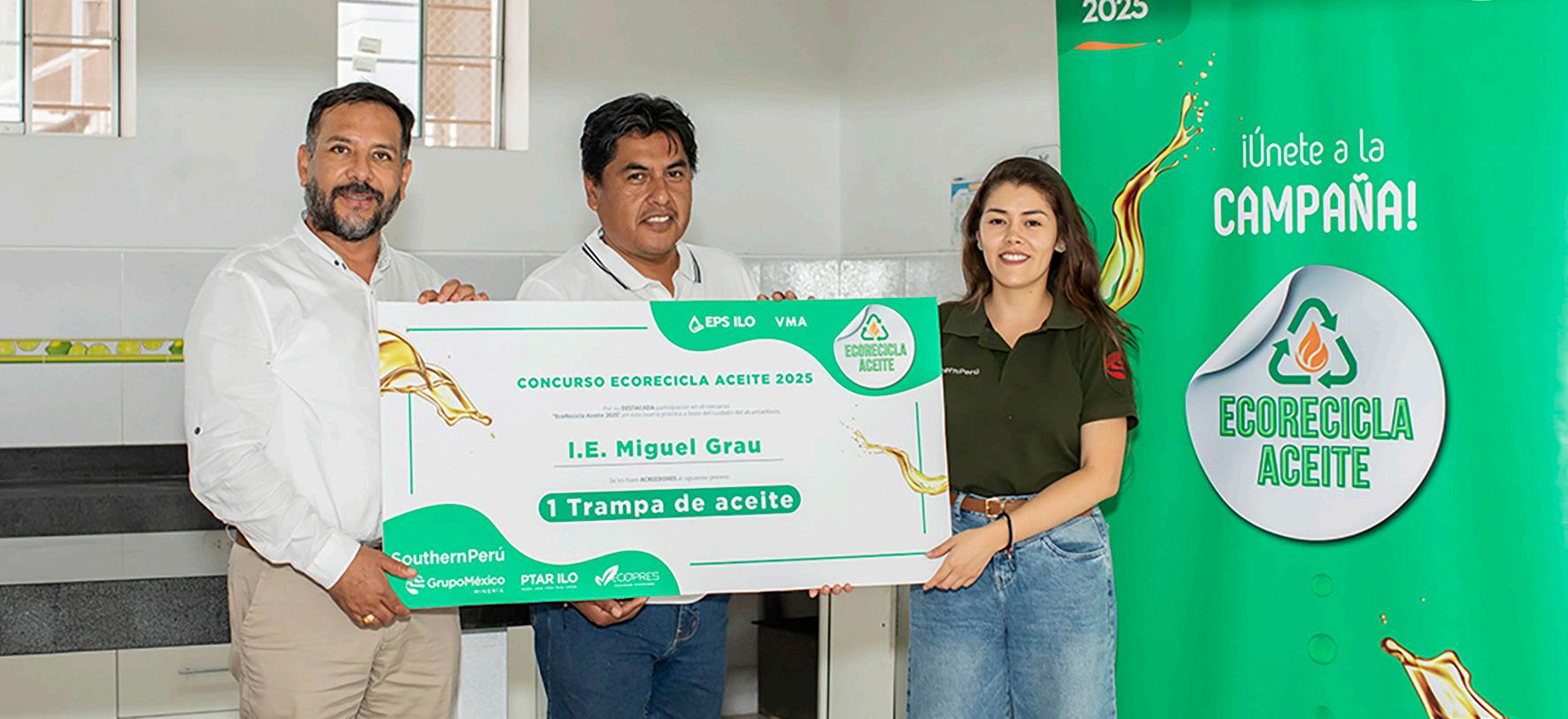 Como parte de la campaña “EcoRecicla Aceite”, iniciativa impulsada por Southern Perú y la EPS Ilo, se realizó la entrega de trampas de grasa a los establecimientos ganadores del concurso de reciclaje de aceite de cocina usado, en reconocimiento a su compromiso con el adecuado manejo de residuos y la protección del sistema de alcantarillado de la ciudad.