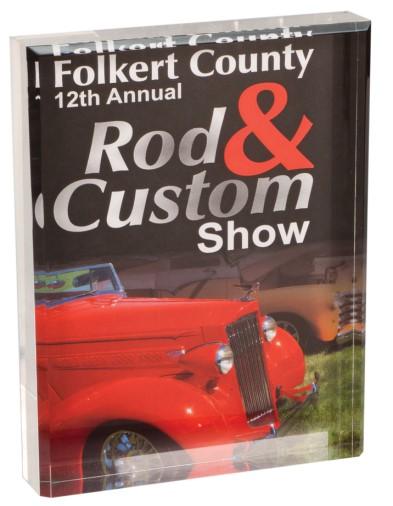 Image is dye sublimated on back of 1” thick clear acrylic award. This process creates a full color image projecting depth.