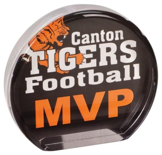 Image is dye sublimated on back of 1” thick clear acrylic award. This process creates a full color image projecting depth.