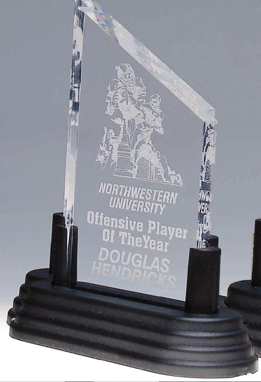 Self-standing acrylic awards, no bases needed. 1-1/4” thick with flat surface. Price includes laser engraving.
