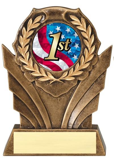 HIGH RELIEF CIRCULAR BRASS PLATE AWARDS Bronze finish with gold highlights. 7-1/2” tall and the price includes a laser engraved plate approximately 3/4” x 2-1/2”