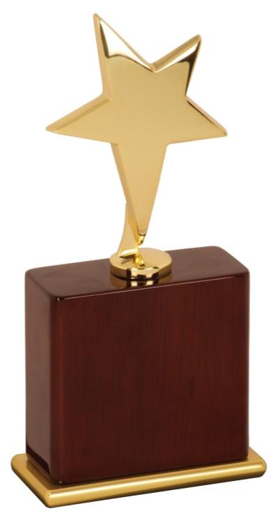 8” Gold Star Award on a Rosewood Piano Finish Base. Star is 5/16” thick and 4-1/4” high. Base is: 3-1/4” (H) x 3-3/8” (W) x 1-5/8” (D) Plate Area is 3” x 3”