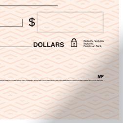Checks include six areas of imprinting (shown above) at no additional charge. Consecutive numbering is included in the MICR encoding. A second signature line or other wording in the signature area is available on most checks.