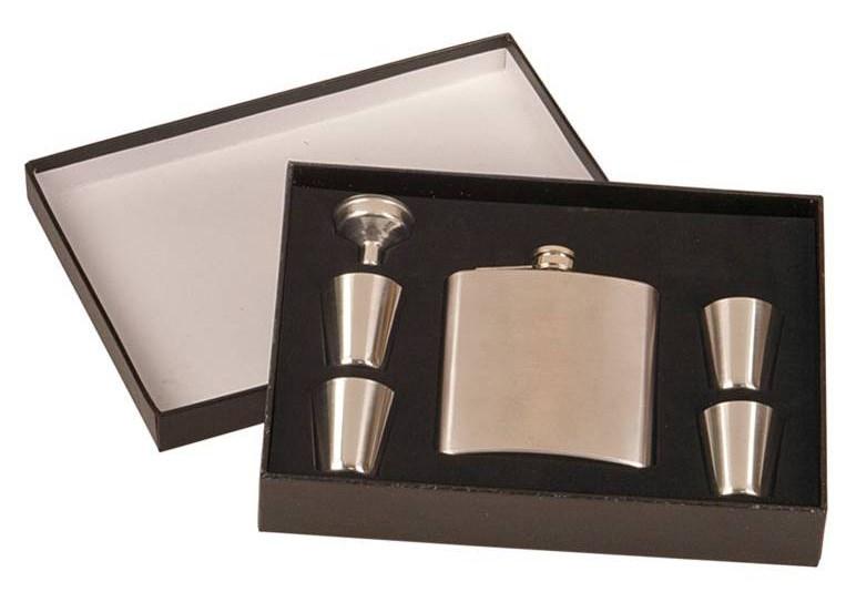 6 oz. Stainless Steel Flask Four Stainless Steel Shot Glasses Funnel Presentation Box