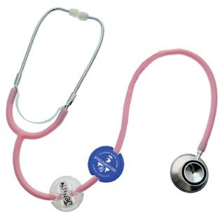 This colorful round plastic identification tag clasps around the rubber tubing of the stethoscopes.