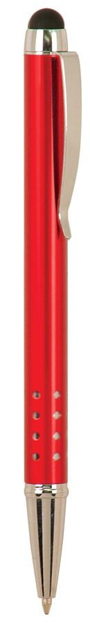 Twist open pen. Black ink. Stylus is on top. Silver trim.