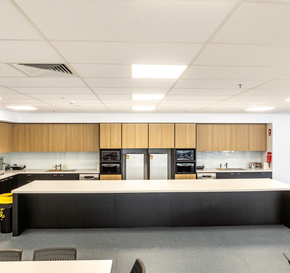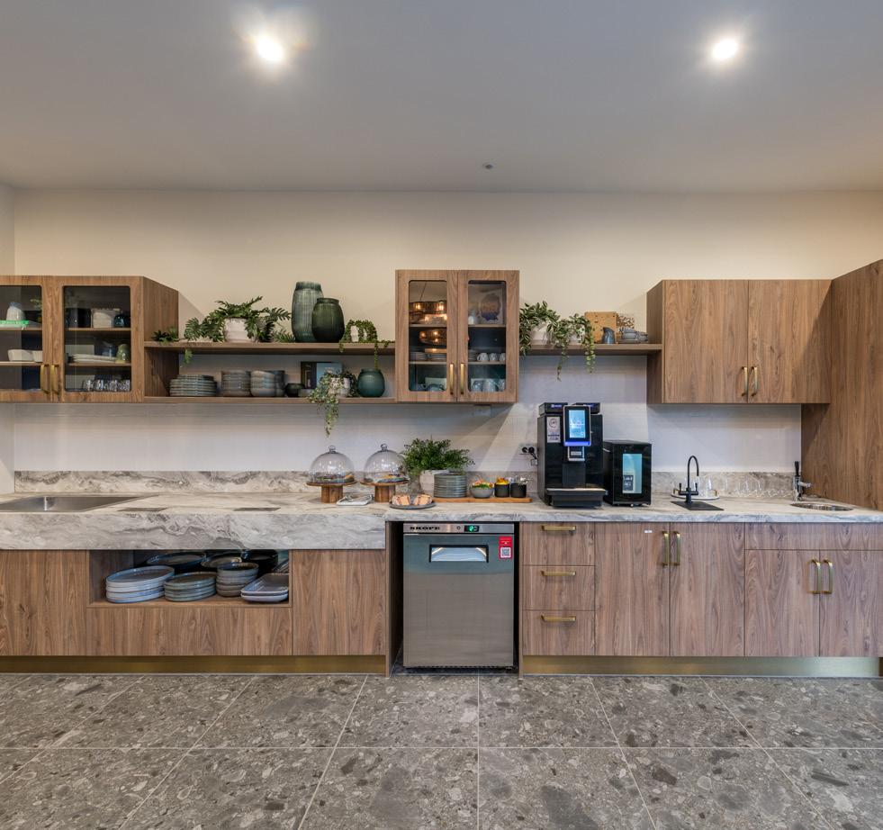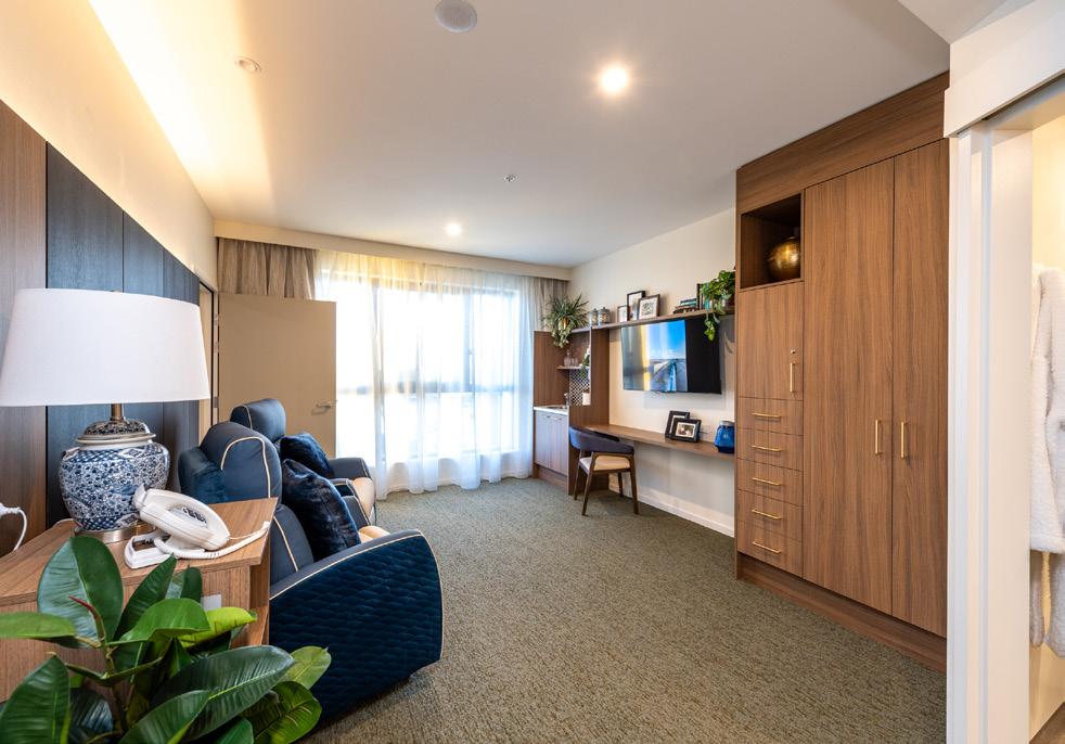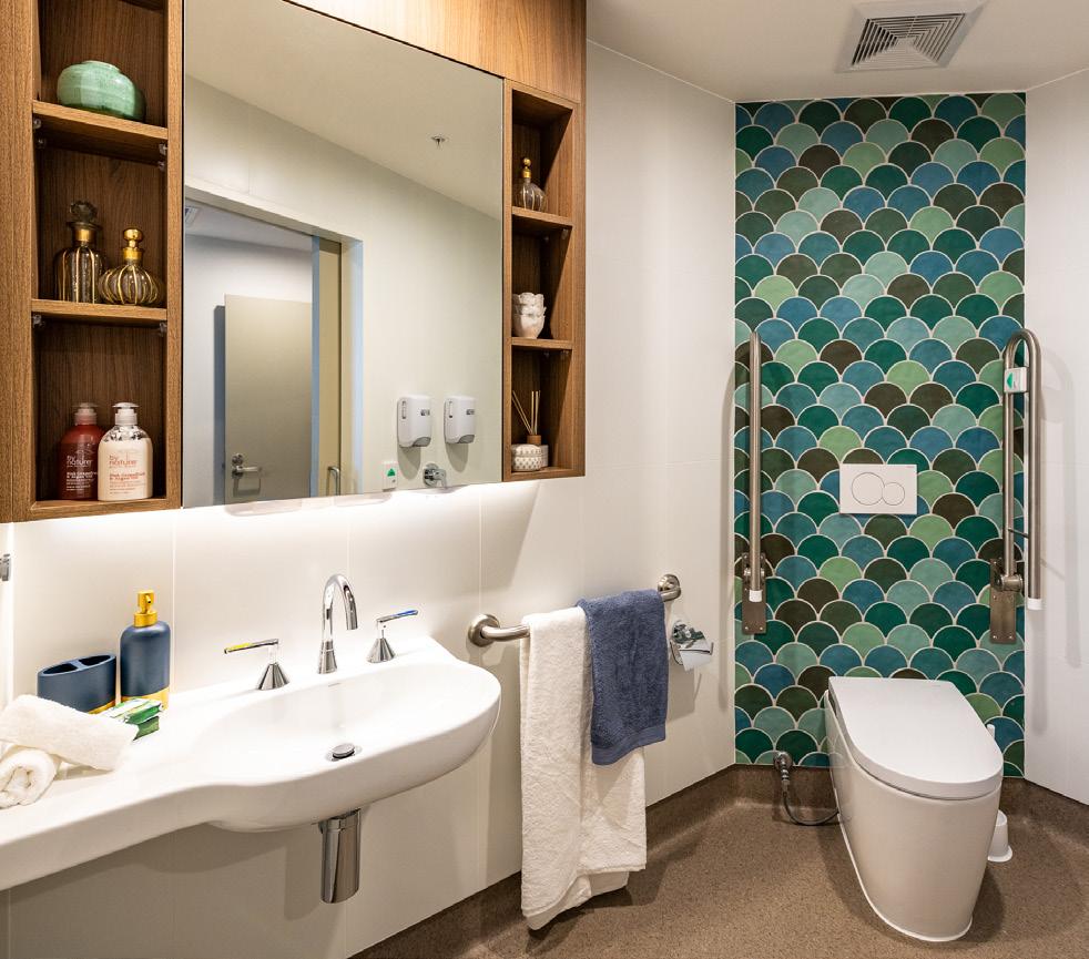 A total of 144 tonnes of joinery was supplied and installed across 153 rooms, including wardrobes, desks, bedheads and mirrored cabinets, all designed and manufactured to support daily living requirements while maintaining a highquality finish.