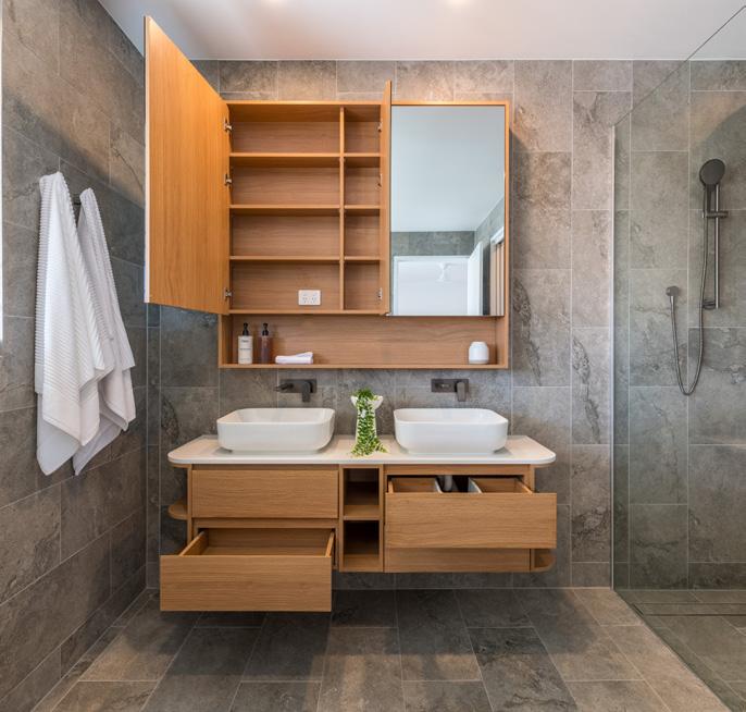 Custom joinery for 15 luxury waterfront townhouses at Stockland’s Lake Residences at Newport, including full size kitchens, bathrooms, and wardrobes with modern finishes.