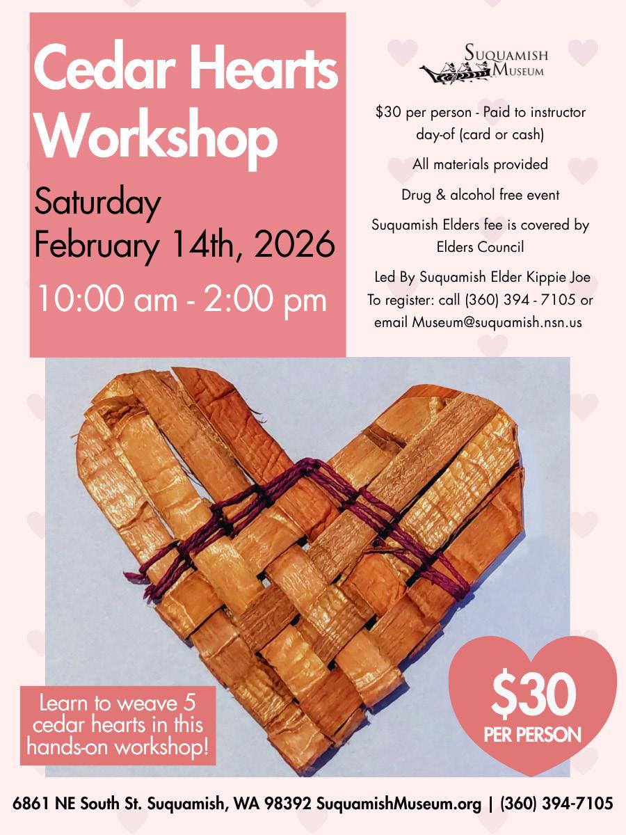 Suquamish Seafoods Board next mtg. Feb. 24, at 1pm. Call Shanel Carlson at (360) 394-8512 for details.