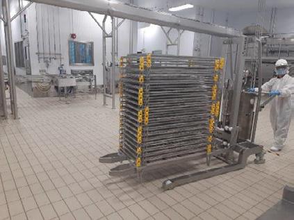 Sehr oft müssen die Bleche und Gestelle, die für den Transport und die Reifung/Trocknung der Käseportionen verwendet werden, vor der erneuten Verwendung gereinigt und desinfiziert werden. Wir haben eine Reihe von Lösungen, die auf unseren Staplern/Liftern basieren, um sie in bzw. aus den Reinigungsmaschinen zu laden.