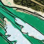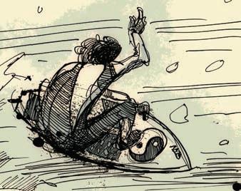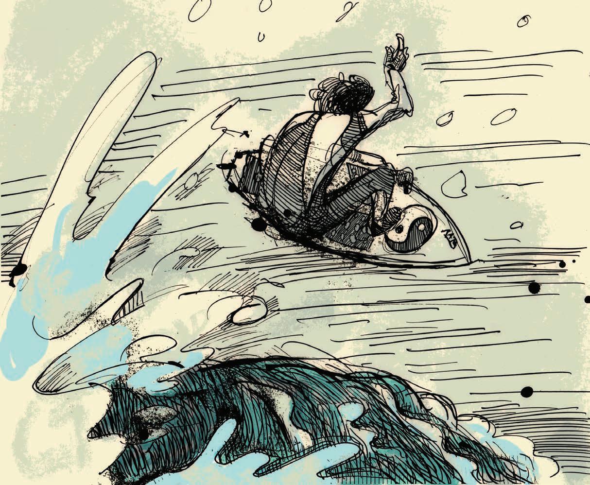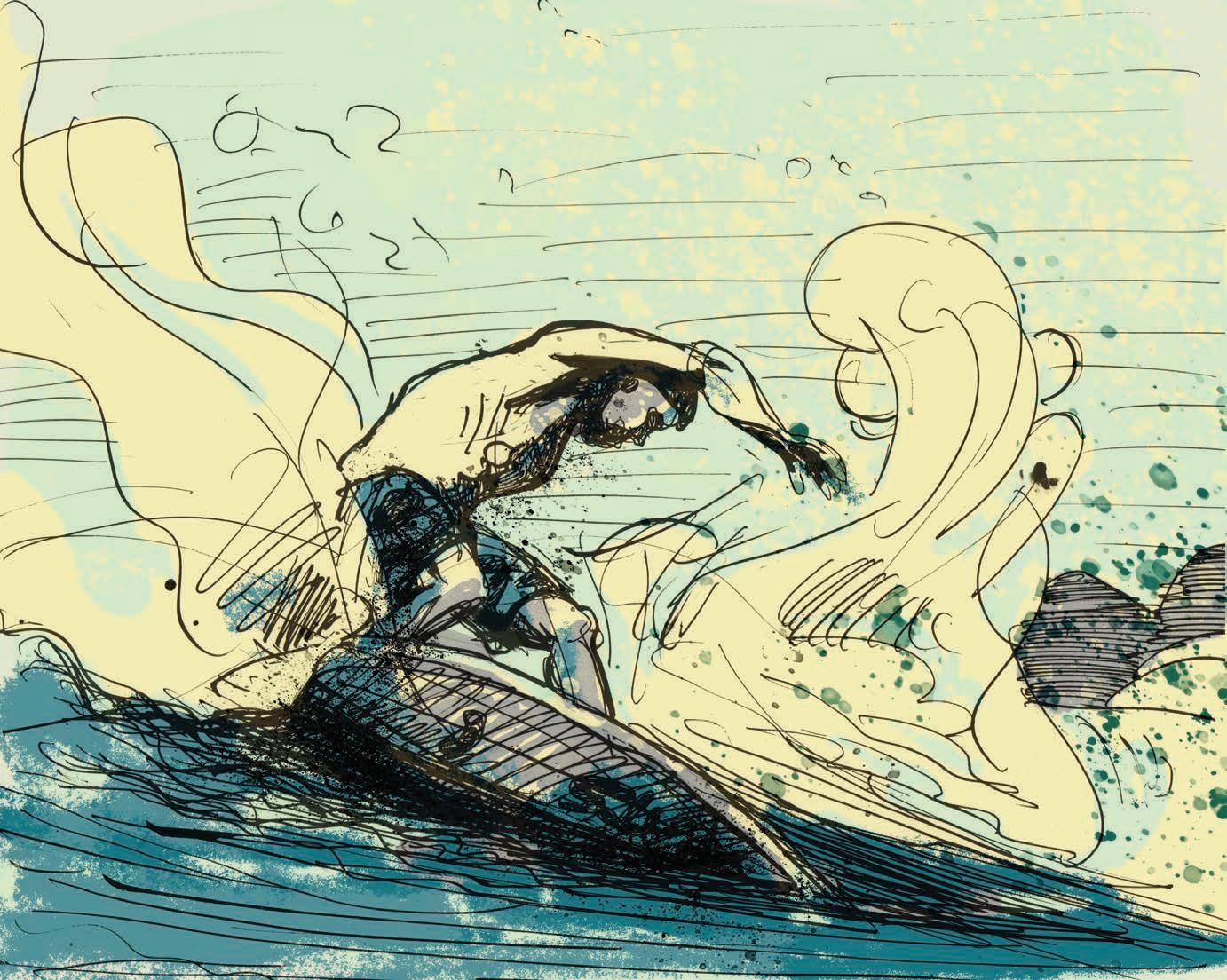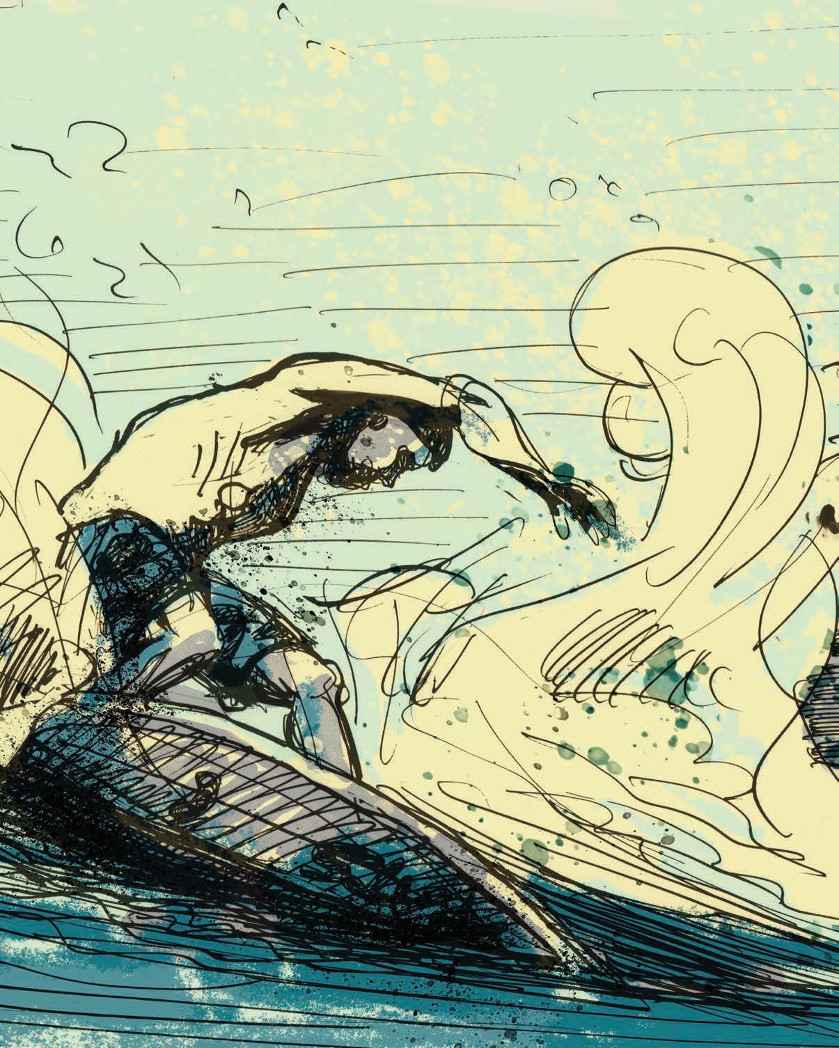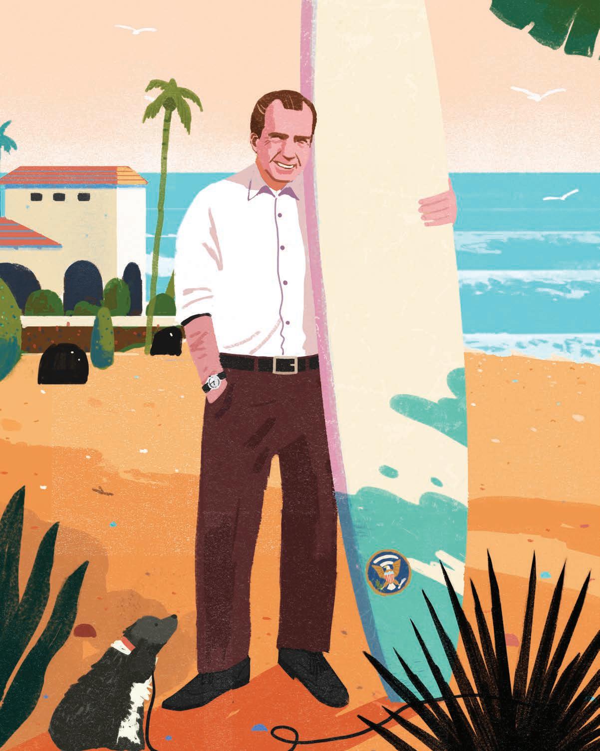 It begins with the 37th President of the United States, Richard Nixon, who owned a compound just steps from Trestles while he was in the White House. One “beautiful sunny day,” as Nixon’s aide John Ehrlichman remembered it, the President walked along a stretch of sand controlled by the U.S. military and suggested the “clean ocean water” should be open to the public. Exactly why remains a bit of a mystery, as writer Alex Roth explains: “Like many stories involving the only U.S. president to resign from of ce, this one involves political calculations, feelings of betrayal and possible ulterior motives.” Nixon’s decision had a signi cant impact on sur ng around the world. Trestles’ clean, consistent waves provided a canvas for athletes to test what was possible on a surfboard and broaden the sport’s appeal in the coming decades. Illustrator Alvar Sirlin captures some of those moments