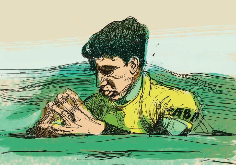 RICHARD: Kelly likes to sleep in. He is not going to be the rst one up. You have to wake him up and make sure you got everything and get him there. For me that was the big responsibility. It’s interesting what he says when I go ‘it’s the morning of the nals.’ He goes ‘no, it’s the morning of the quarter nals.’
