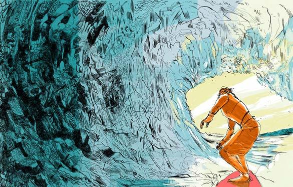 For clues we turn in this issue to “Pipeline,” a Hawaiian wave on the North Shore of Oahu that is now at its most intimidating as Arctic storms roll south and mix with the tropical air of the Western Pacific. Pipeline presents countless perils, from its steep drop and treacherous lip to a cavernous mass of coral reef waiting just below the water’s surface. Surfers that survive those hazards submit to a whirling funnel of water and a shower of spray.