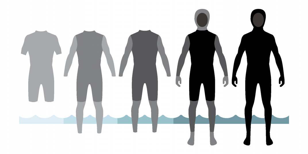 Each wetsuit has either two or three numerals that indicate how thick the layer of neoprene is, ranging from one to six millimeters. The larger number refers to the “core“ part of the suit – meaning the torso and legs. The smaller number refers to portions of the suit where flexibility is needed most – sleeves and gussets. A “4-3” wetsuit, for example, has four millimeters of neoprene around the chest and three millimeters throughout the sleeves. Wetsuits for the coldest conditions have three numerals, in which case the third refers to the hood or wrist seals. Maximum thickness is typically six millimeters, needed for water below 40 degrees Fahrenheit. That “will afford someone at least an hour or two in the lineup,” Federoff says. “Of course each person is different and a tolerance for cold can vary greatly.”