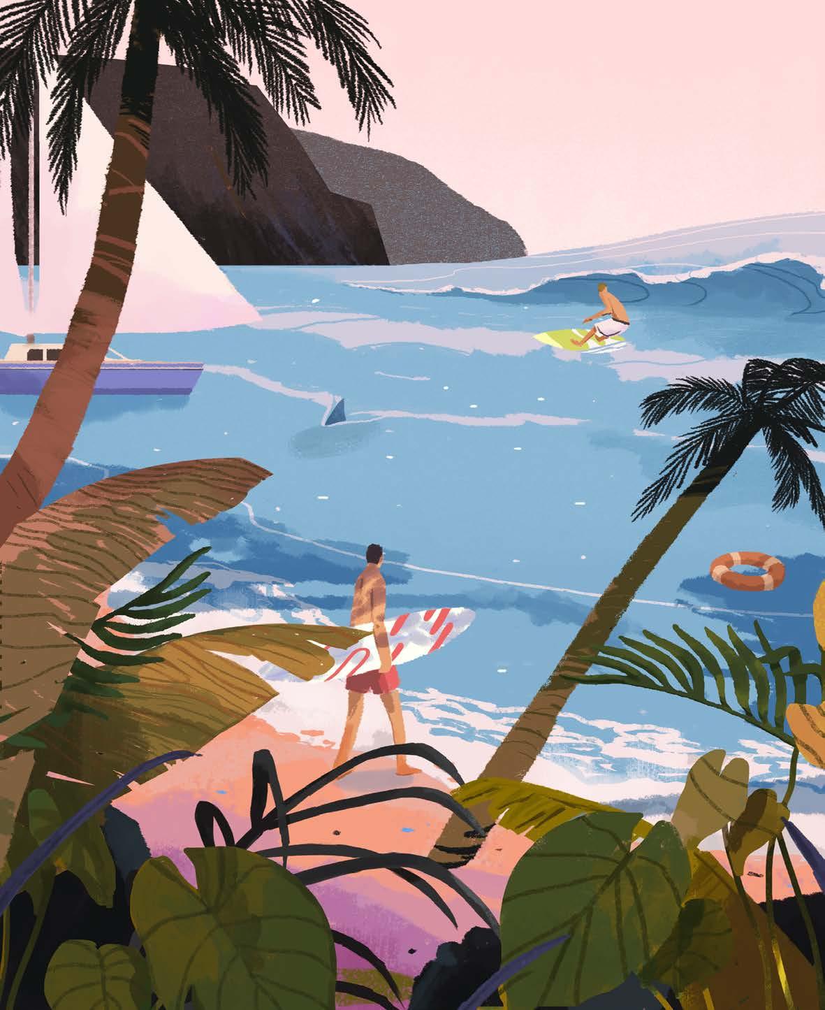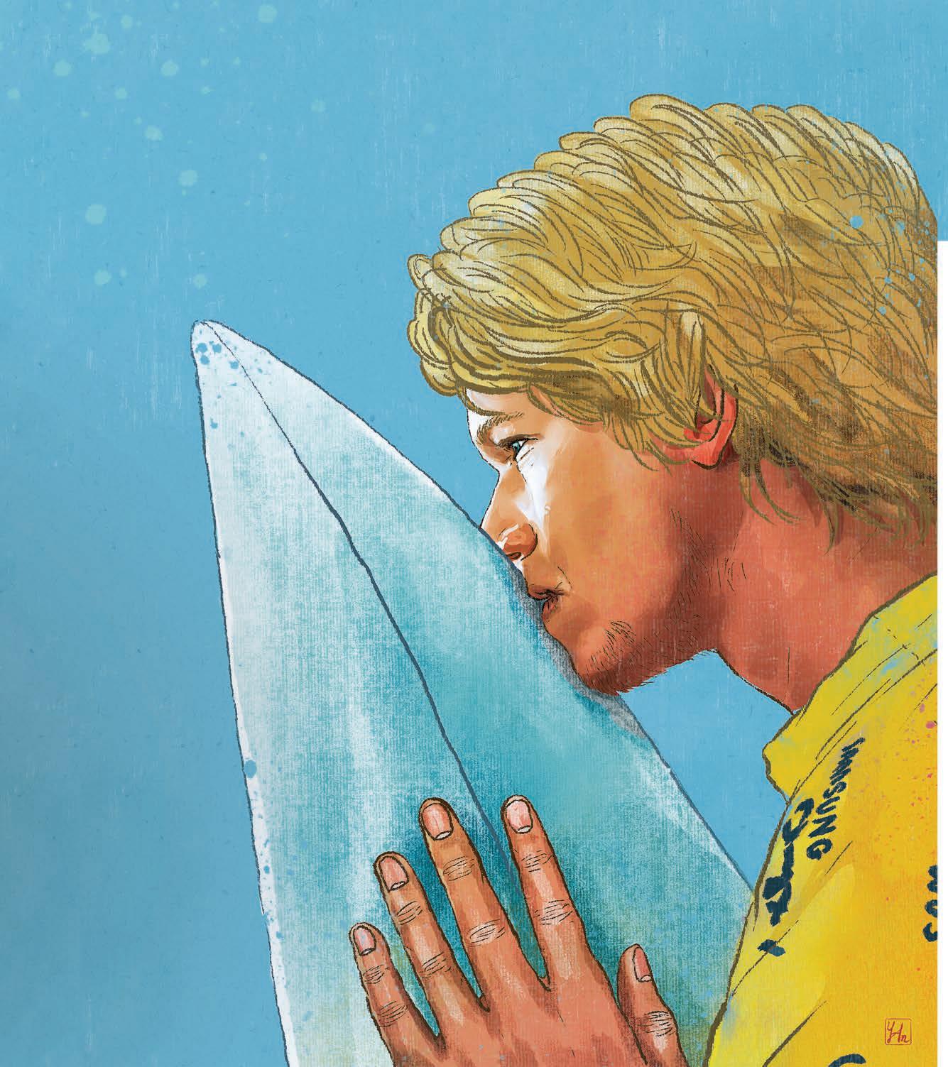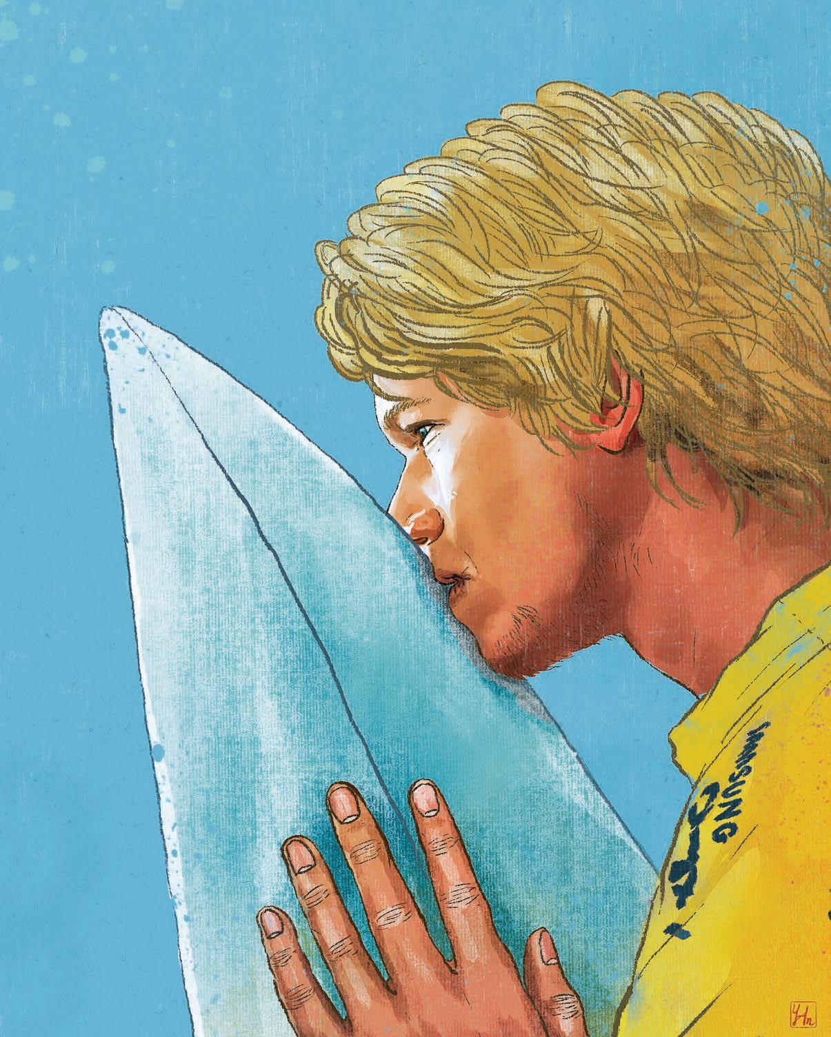 I think I was about seven and my dad was like, now’s the time. He bought a helmet for me to make sure I was extra safe. It was small surf so I wouldn’t say it was real-deal Pipeline, but when you’re seven years old, it was realdeal Pipeline. But then, when I was a little older, me and Mark Healey and a couple guys went out when it was like, oh, shit, this is the real-deal Pipeline. I think I was 11 or 12. It was the first big day that any of us had been out there. We weren’t sure if we were supposed to be out there or not. The lifeguards didn’t really say anything. I just remember we were all real scared, real timid, not knowing the right or wrong things to do in the lineup. I remember getting really pounded that day. Johnny-Boy Gomes told me to go on this wave and I broke my board in three pieces and I was just really discouraged and not sure if I liked it. It was pretty crazy. I just remember Johnny-Boy telling me, “Go! Go!” and I think at the end of the day what I realized is that it wasn’t a very good wave. Everything was just a giant learning curve when you’re a little kid. I’m still learning out there and I’ve been surfing Pipe for 20–25 years. So we just went out there and got ragdolled and at the end of the day we all re-checked ourselves and that was kind of our turning point to be men.