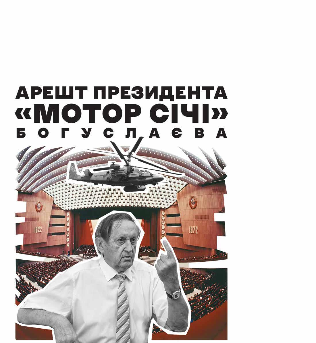 лужба безпеки України підтвер дила затримання президента АТ «Мотор Січ», генерального конструктора зі створення та модер нізації вертолітної техніки В’ячеслава Богуслаєва. Як йдеться у повідомленні СБУ, «президента промислового гіганта «Мотор Січ» було затримано за підоз рою у роботі на рф». У цій же справі також затримали начальника департа менту зовнішньоекономічної діяль ності підприємства. Їм оголосили про підозру за двома статтями Криміналь ного кодексу України — колаборацій на діяльність та пособництво державі агресору. Це також підтвердили в Офісі генпрокурора.