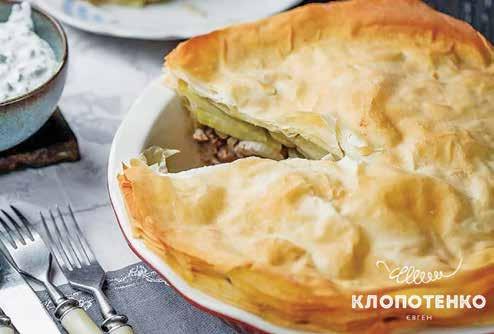 стоятися і знов розкочують. Так кілька разів. Через це воно має кілька шарів. Ми спростили цей крок, взявши готове тісто філо, що також виходить із шарами, але більш хрустке. Начинка. Яловичина, цибуля та картопля — це найбільш популярний варіант. Але ви можете взяти будь-яке інше м’ясо, що вам смакує. Головне, не забудьте додавати сіль та перець між шарами начинки, щоб пиріг не вийшов прісним. Також важливо попередньо трохи підварити картоплю, інакше вона може залишитися сирою після випікання.