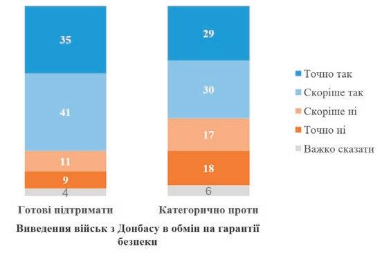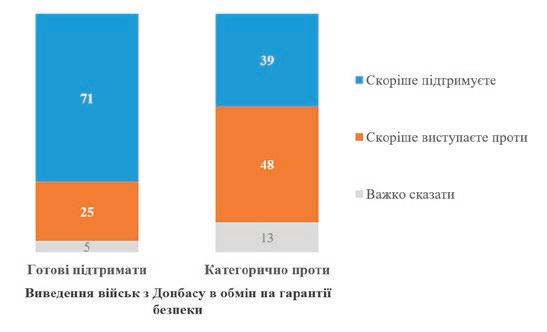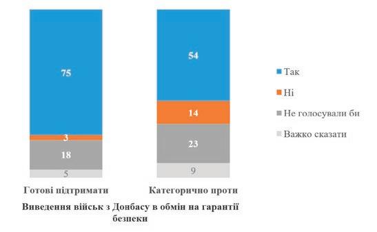 гарантії безпеки. Як можна бачити, ідею референдуму значно більше підтримують ті, хто вже готовий схвалити виведення українських військ з Донбасу в обмін на гарантії безпеки. Серед них 71% по-