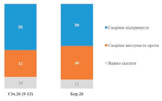 ідеї референдуму. Відносна більшість українців підтримують ідею проведення референдуму, хоча є тенденція до погіршення ставлення до цієї ідеї. Так, порівняно з серединою січня 2026 року з 55% до 50% стало менше тих, хто підтримують таку ініціативу. Натомість з 32% до 40% стало більше тих, хто виступає проти.